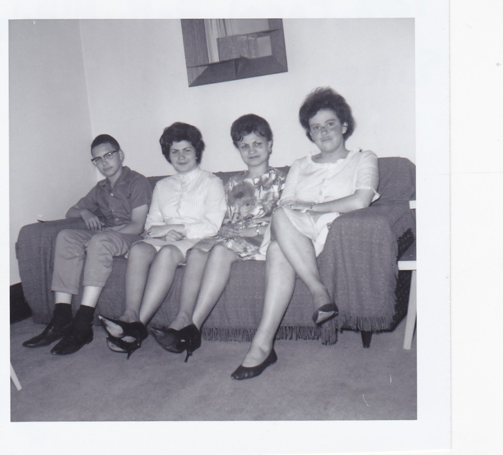 Here’s a davenport full of family. Eileen Regan, Margaret McMahon Nelson, John Regan, and Agnes McMahon Regan at the Regan house on Tenth Avenue in South Minneapolis in the late 1950s.