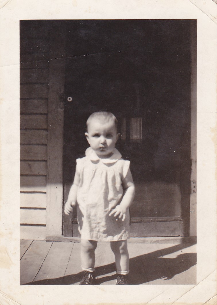 Fran is in my grandma’s arms, with sister Lorna and a friend looking on. Benson, MN. (Private Family Collection)