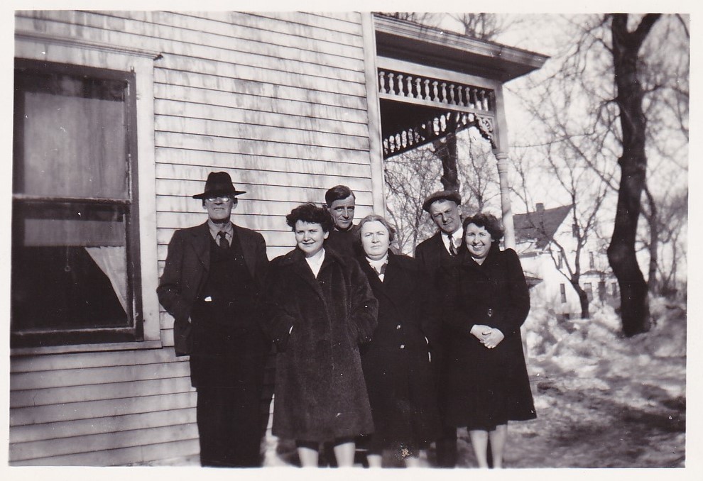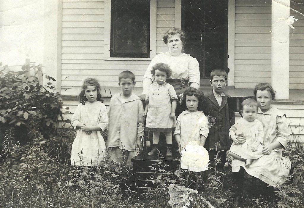 My great-grandmother Mary Foley McMahon is with her seven children outside of their Clontarf, Minnesota, home. My grandma(Agnes) is standing on the chair before her mother.