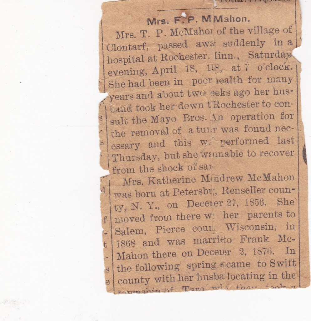 Information in this article is from copied pages from the St. Malachy Financial Records from Eileen McCormack’s files. These copies and the information contained here do not represent the complete financial record. The excerpts were copied by Eileen McCormack when the books were at the parish house in Clontarf, 2004-2005. Record books are presently at St. Francis Catholic Church in Benson, Minnesota.