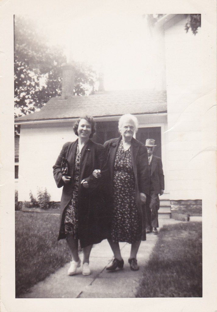 Not sure what house this is, or the date. My guess is that it is my grandparents’ house and it is about 1943. On the left is my grandma’s sister Rose McMahon (we called her Dodo) walking with her mother, Mary Foley McMahon. Trailing behind is my great-grandfather Neil Regan.